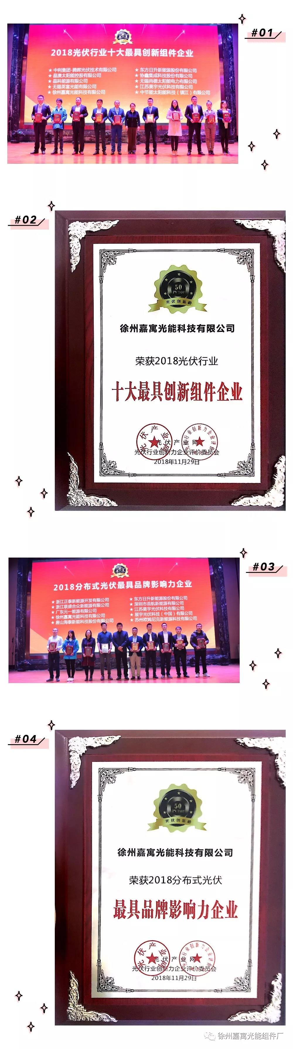 徐州嘉寓光能受邀參加此次盛典,憑借技術的創(chuàng)新以及高效的產(chǎn)品,再次斬獲“2018光伏行業(yè)十大最具創(chuàng)新組件企業(yè)” 以及“2018最具品牌影響力企業(yè)”兩項大獎。