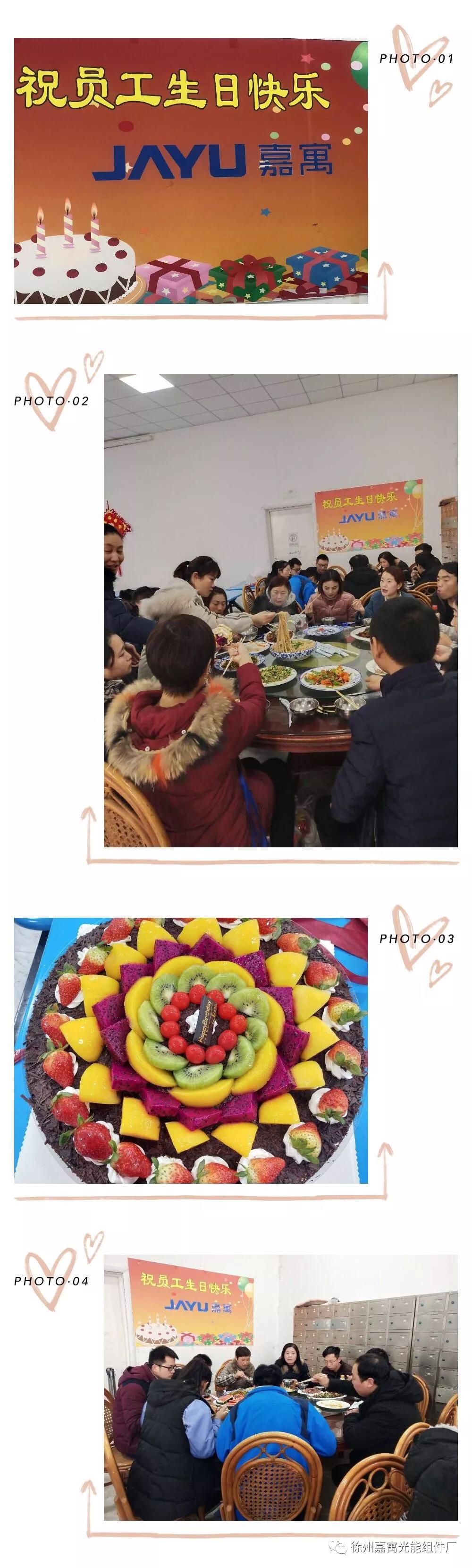 嘉寓光能一直致力于打造溫馨和睦、包容奉獻的大家庭,努力營造出輕松和諧的工作氛圍,讓每一位員工切身感受來自大家庭的溫暖。所以,每個月我們都有一個特別的日子,它傾注了公司對員工的親切關懷和愛。一個大大的生日蛋糕,一碗滿滿的長壽面,一餐豐盛的美食,一張張幸福的笑臉,讓整個生日會都蕩漾在了溫馨幸福的長河里。