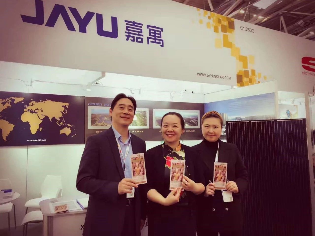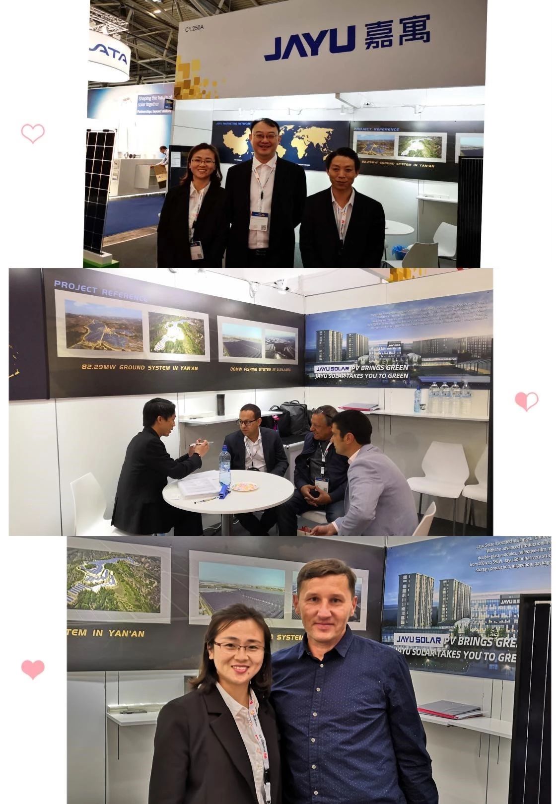 嘉寓光能本次參展由總經(jīng)理陳志榮先生親自帶隊(duì),攜嘉寓光能業(yè)務(wù)副總?cè)椒濉I(yè)務(wù)總監(jiān)車競(jìng)以及海外業(yè)務(wù)部門多位高管,組成了參加展會(huì)的核心團(tuán)隊(duì),奔赴德國(guó)慕尼黑。本次嘉寓光能在2019年德國(guó)慕尼黑國(guó)際太陽(yáng)能展展示了半片系列光伏組件、雙玻系列光伏組件以及全黑光伏組件系列。三款系列產(chǎn)品采用了嘉寓光能最新的高效技術(shù),功率均突破了400W,光伏組件的4.0時(shí)代,嘉寓光能已經(jīng)有了一席之地。尤其是半片系列光伏組件,最高功率可達(dá)450W,成為國(guó)內(nèi)外友人討論的焦點(diǎn)之一,是嘉寓光能在本屆展會(huì)中當(dāng)之無(wú)愧的“明星產(chǎn)品”。在為期三天的展會(huì)中,嘉寓光能和三款系列產(chǎn)品組件吸引了眾多業(yè)內(nèi)人士的關(guān)注,并接受了來(lái)自多個(gè)國(guó)家項(xiàng)目方的咨詢,活動(dòng)現(xiàn)場(chǎng)與我方達(dá)成了初步的合作意向的客戶鱗次櫛比。