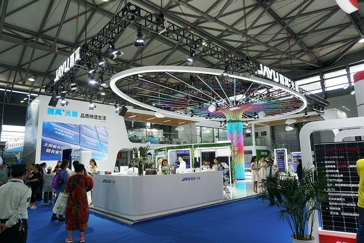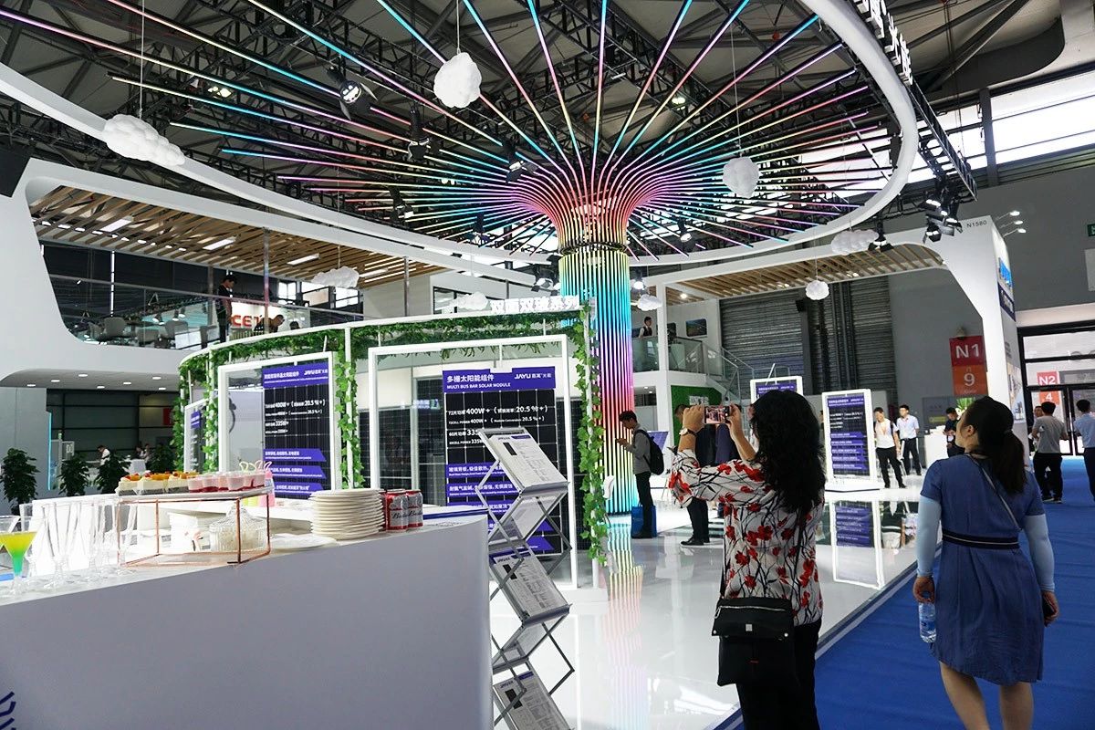 嘉寓光能展位位于N1展館580展臺,主色調(diào)以象征著藍天白云的嘉寓藍和白色構(gòu)成,凸顯了清潔能源的特色。同時展臺中央一棵巨大的七彩能量樹拔地而起,象征陽光能源的彩色光束從地面升空,在頂端向整個展臺四周發(fā)散,將希望的陽光,普照天下。
